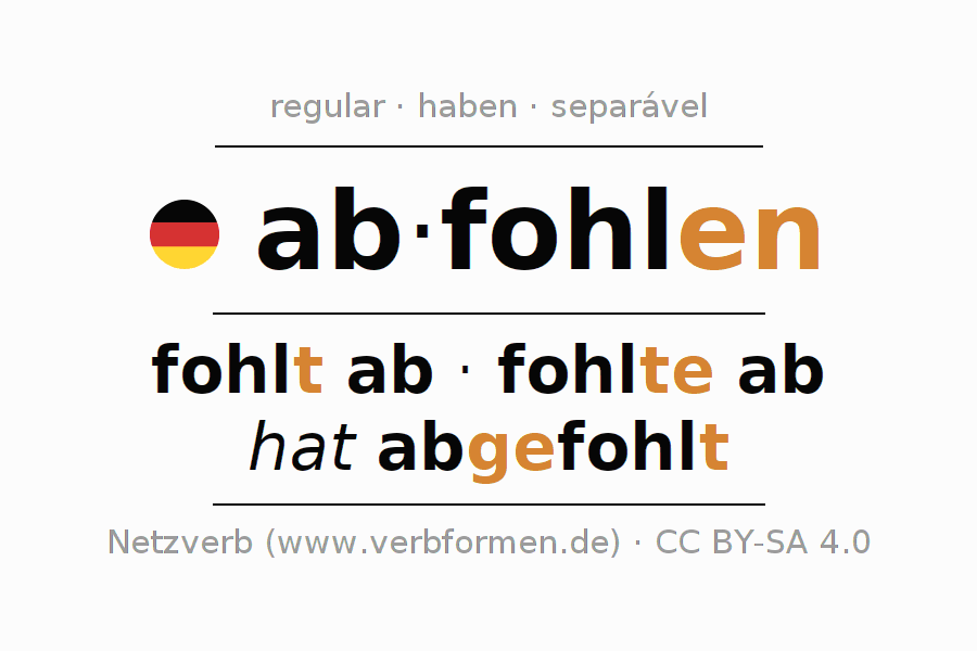 A conjugação do verbo ab·fohlen é apresentada online assim como a Tabela de Verbo com todas as formas verbais no singular e no plural, e em todas as pessoas (1ª pessoa, 2ª pessoa, 3ª pessoa) A flexão do verbo ab·fohlen é portanto, uma ajuda para os trabalhos de casa, testes, exames, aulas de alemão, para o estudo do alemão como língua estrangeira, como segunda língua e também na formação de adultos. Especialmente no aprendizado do alemão é importante a conjugação correta do verbo com as respectivamente formas flexionadas corretamente (fohlt ab - fohlte ab - hat abgefohlt). Mais informações podem ser encontradas no Wiktionary abfohlen e no Duden abfohlen.