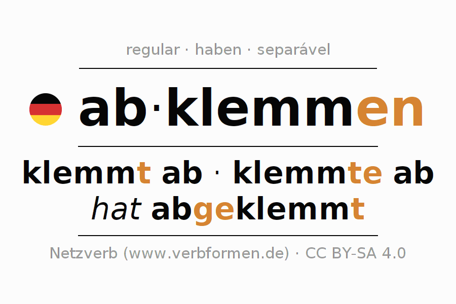 A conjugação do verbo abklemmen (desconectar, desligar) é regular. As formas mais comuns são klemmt ab, klemmte ab e hat abgeklemmt. O verbo auxilar para abklemmen é "haben".