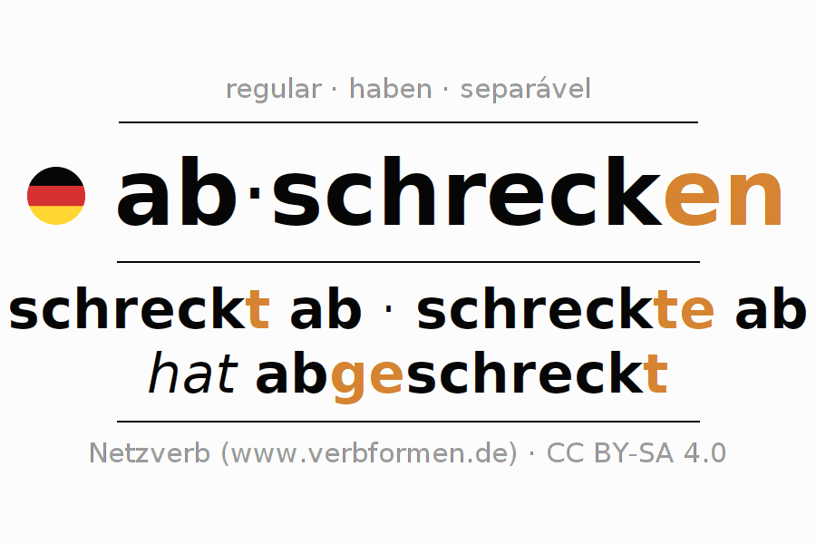 O prefixo ab - de abschrecken é separável. A flexão ocorre em Ativo e é usada como Oração principal. Para melhor compreensão estão disponíveis incontáveis. Exemplos do verbo abschrecken . Para a prática e consolidação do estudo