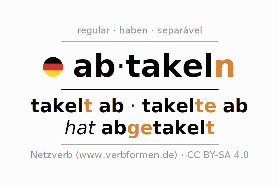 A conjugação do verbo ab·takeln é apresentada online assim como a Tabela de Verbo com todas as formas verbais no singular e no plural, e em todas as pessoas (1ª pessoa, 2ª pessoa, 3ª pessoa) A flexão do verbo ab·takeln é portanto, uma ajuda para os trabalhos de casa, testes, exames, aulas de alemão, para o estudo do alemão como língua estrangeira, como segunda língua e também na formação de adultos. Especialmente no aprendizado do alemão é importante a conjugação correta do verbo com as respectivamente formas flexionadas corretamente (takelt ab - takelte ab - hat abgetakelt). Mais informações podem ser encontradas no Wiktionary abtakeln e no Duden abtakeln.