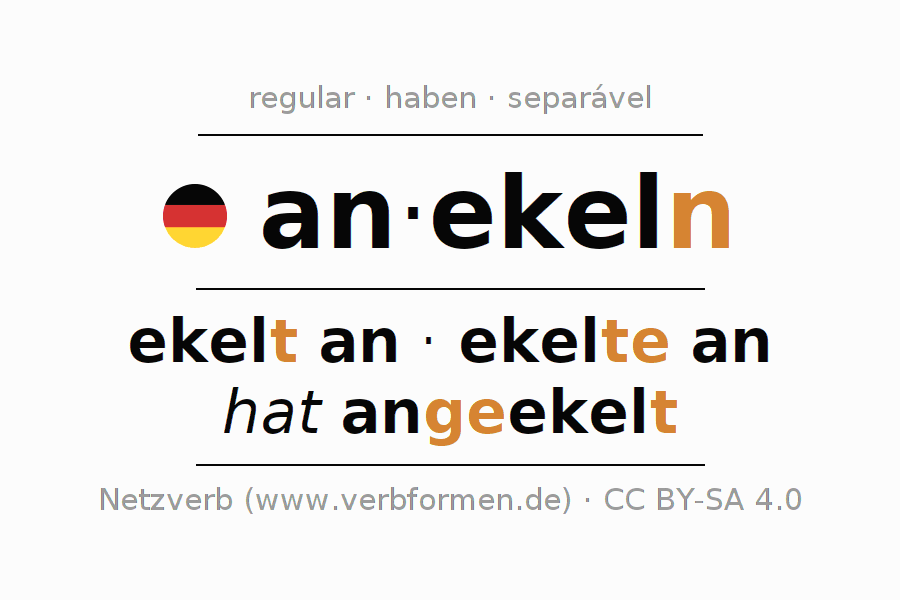 A conjugação do verbo anekeln (repugnar, causar nojo a) é regular. As formas mais comuns são ekelt an, ekelte an e hat angeekelt. O verbo auxilar para anekeln é "haben".