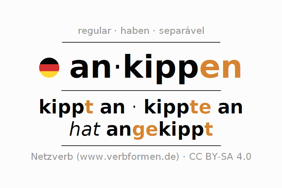 A conjugação do verbo ankippen (inclinar, tombar) é regular. As formas mais comuns são kippt an, kippte an e hat angekippt. O verbo auxilar para ankippen é "haben".