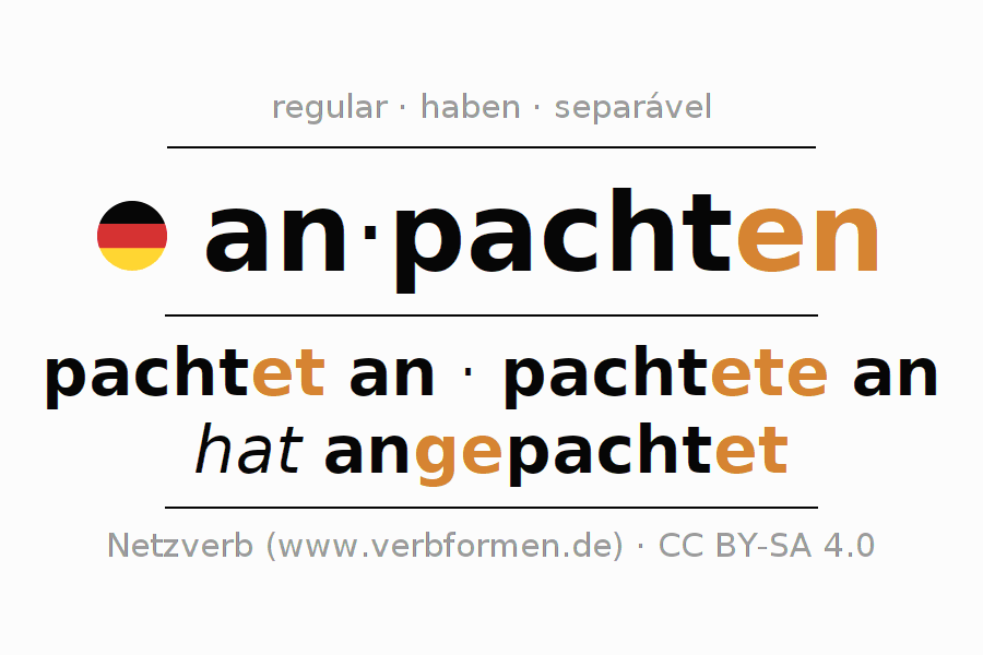 - Presente: pacht(e) (du) an, pachten wir an, pachtet (ihr) an, pachten Sie an