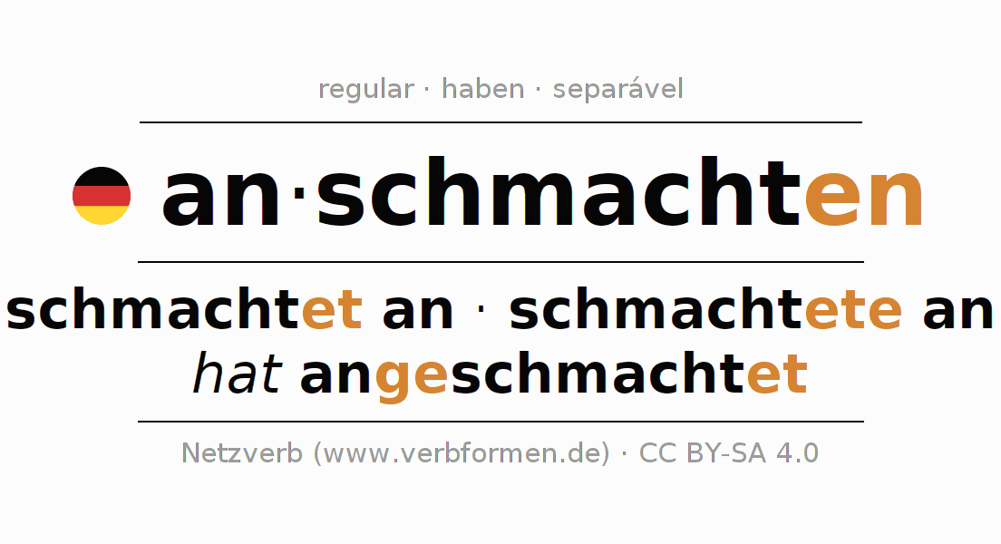 A conjugação do verbo anschmachten (ansiar, desejar) é regular. As formas mais comuns são schmachtet an, schmachtete an e hat angeschmachtet. O verbo auxilar para anschmachten é "haben".