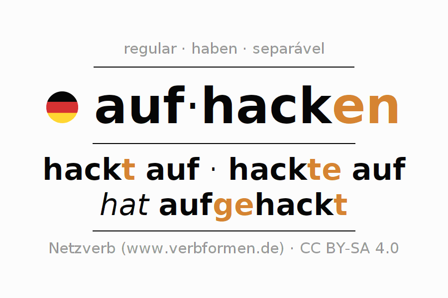 A conjugação do verbo auf·hacken é apresentada online assim como a Tabela de Verbo com todas as formas verbais no singular e no plural, e em todas as pessoas (1ª pessoa, 2ª pessoa, 3ª pessoa) A flexão do verbo auf·hacken é portanto, uma ajuda para os trabalhos de casa, testes, exames, aulas de alemão, para o estudo do alemão como língua estrangeira, como segunda língua e também na formação de adultos. Especialmente no aprendizado do alemão é importante a conjugação correta do verbo com as respectivamente formas flexionadas corretamente (hackt auf - hackte auf - hat aufgehackt). Mais informações podem ser encontradas no Wiktionary aufhacken e no Duden aufhacken.