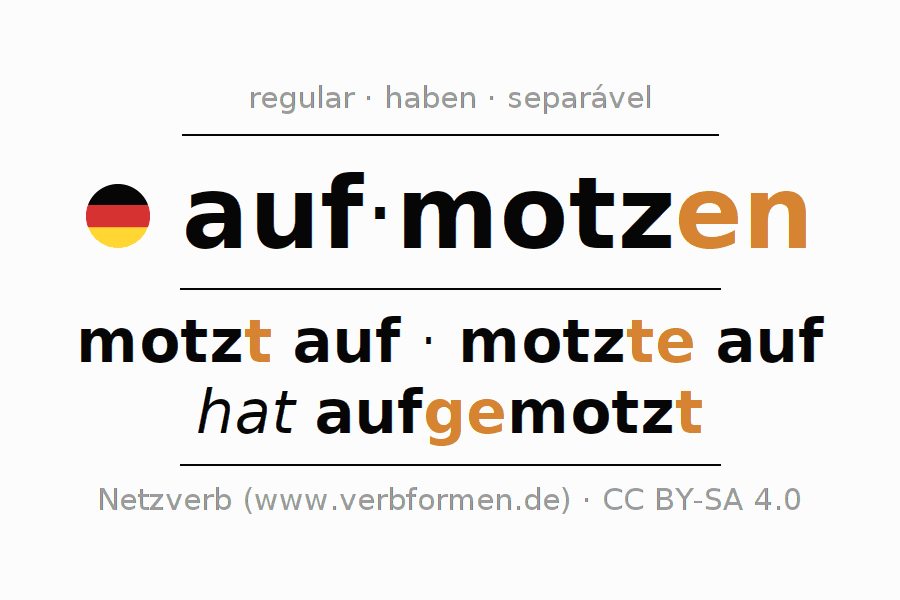A conjugação do verbo aufmotzen (tunar, aprimorar) é regular. As formas mais comuns são motzt auf, motzte auf e hat aufgemotzt. O verbo auxilar para aufmotzen é "haben".