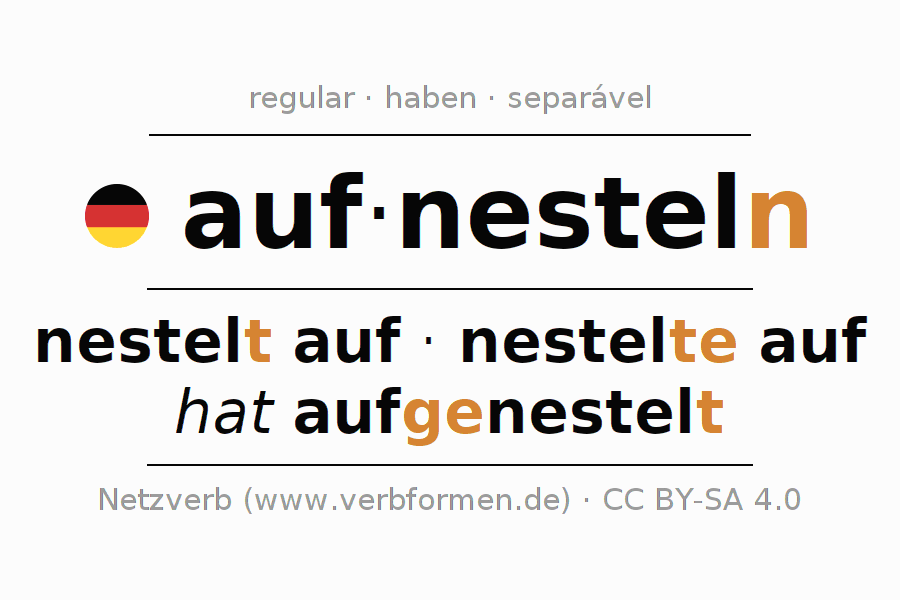 A conjugação do verbo aufnesteln (abrir, destrancar) é regular. As formas mais comuns são nestelt auf, nestelte auf e hat aufgenestelt. O verbo auxilar para aufnesteln é "haben".