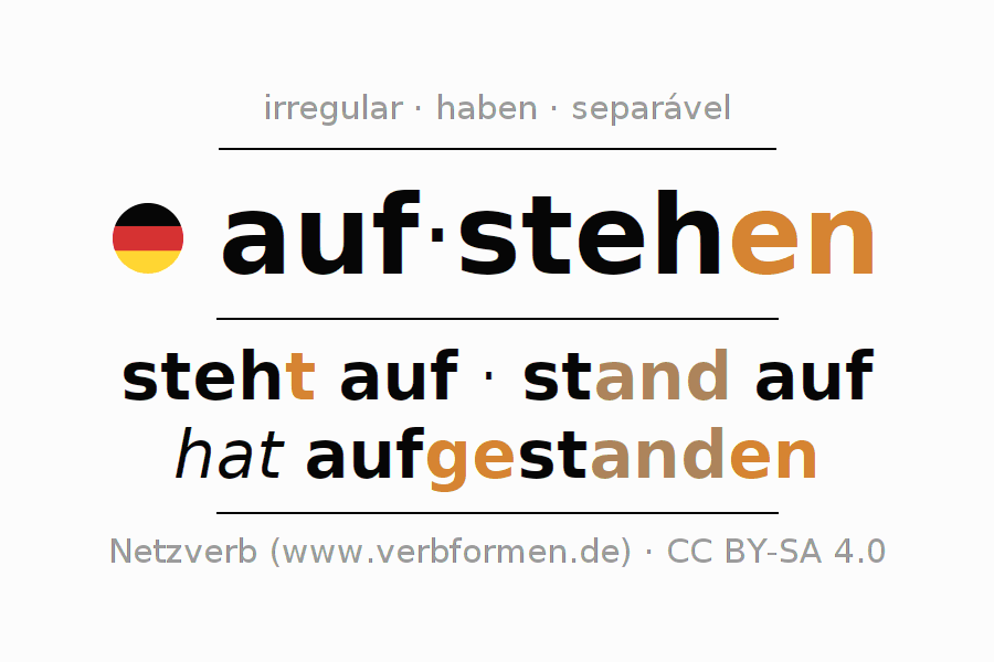 A conjugação do verbo aufstehen (estar aberto) é irregular. As formas mais comuns são steht auf, stand auf e hat aufgestanden. A apofonia é feita com a vogal do radical e
