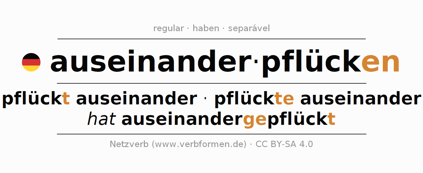 - Presente: pflück(e) (du) auseinander, pflücken wir auseinander, pflückt (ihr) auseinander, pflücken Sie auseinander