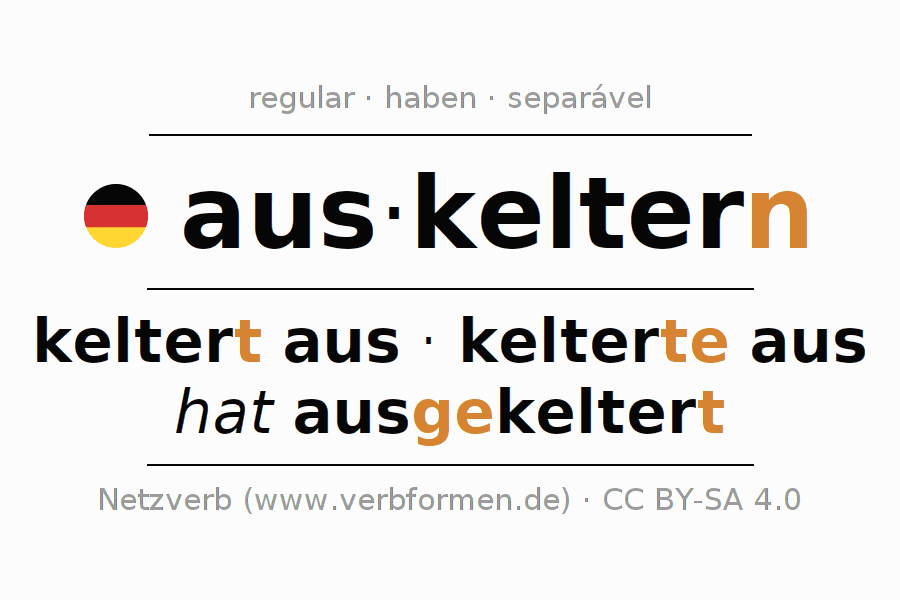 A conjugação do verbo aus·keltern é apresentada online assim como a Tabela de Verbo com todas as formas verbais no singular e no plural, e em todas as pessoas (1ª pessoa, 2ª pessoa, 3ª pessoa) A flexão do verbo aus·keltern é portanto, uma ajuda para os trabalhos de casa, testes, exames, aulas de alemão, para o estudo do alemão como língua estrangeira, como segunda língua e também na formação de adultos. Especialmente no aprendizado do alemão é importante a conjugação correta do verbo com as respectivamente formas flexionadas corretamente (keltert aus - kelterte aus - hat ausgekeltert). Mais informações podem ser encontradas no Wiktionary auskeltern e no Duden auskeltern.