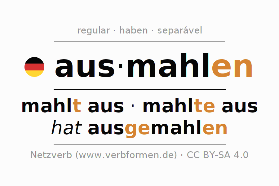 A conjugação do verbo ausmahlen (moer, moer completamente) é regular. As formas mais comuns são mahlt aus, mahlte aus e hat ausgemahlen. O verbo auxilar para ausmahlen é "haben".