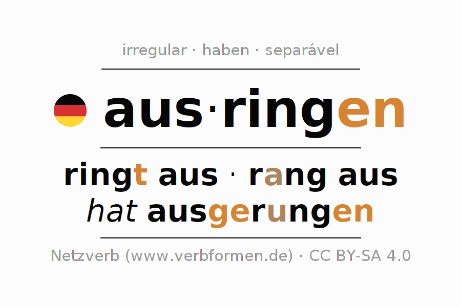 A conjugação do verbo ausringen (espremer) é irregular. As formas mais comuns são ringt aus, rang aus e hat ausgerungen. A apofonia é feita com a vogal do radical i