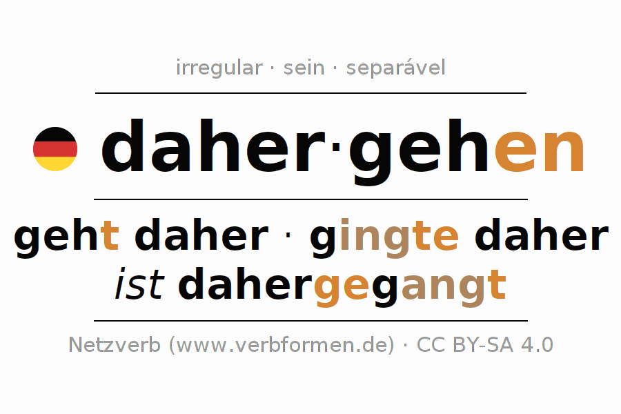 A conjugação do verbo daher·gehen é apresentada online assim como a Tabela de Verbo com todas as formas verbais no singular e no plural, e em todas as pessoas (1ª pessoa, 2ª pessoa, 3ª pessoa) A flexão do verbo daher·gehen é portanto, uma ajuda para os trabalhos de casa, testes, exames, aulas de alemão, para o estudo do alemão como língua estrangeira, como segunda língua e também na formação de adultos. Especialmente no aprendizado do alemão é importante a conjugação correta do verbo com as respectivamente formas flexionadas corretamente (geht daher - gingte daher - ist dahergegangt). Mais informações podem ser encontradas no Wiktionary dahergehen e no Duden dahergehen.