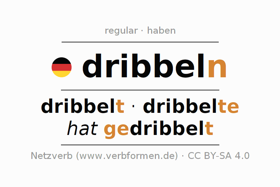 A conjugação do verbo dribbeln é apresentada online assim como a Tabela de Verbo com todas as formas verbais no singular e no plural, e em todas as pessoas (1ª pessoa, 2ª pessoa, 3ª pessoa) A flexão do verbo dribbeln é portanto, uma ajuda para os trabalhos de casa, testes, exames, aulas de alemão, para o estudo do alemão como língua estrangeira, como segunda língua e também na formação de adultos. Especialmente no aprendizado do alemão é importante a conjugação correta do verbo com as respectivamente formas flexionadas corretamente (dribbelt - dribbelte - hat gedribbelt). Mais informações podem ser encontradas no Wiktionary dribbeln e no Duden dribbeln.