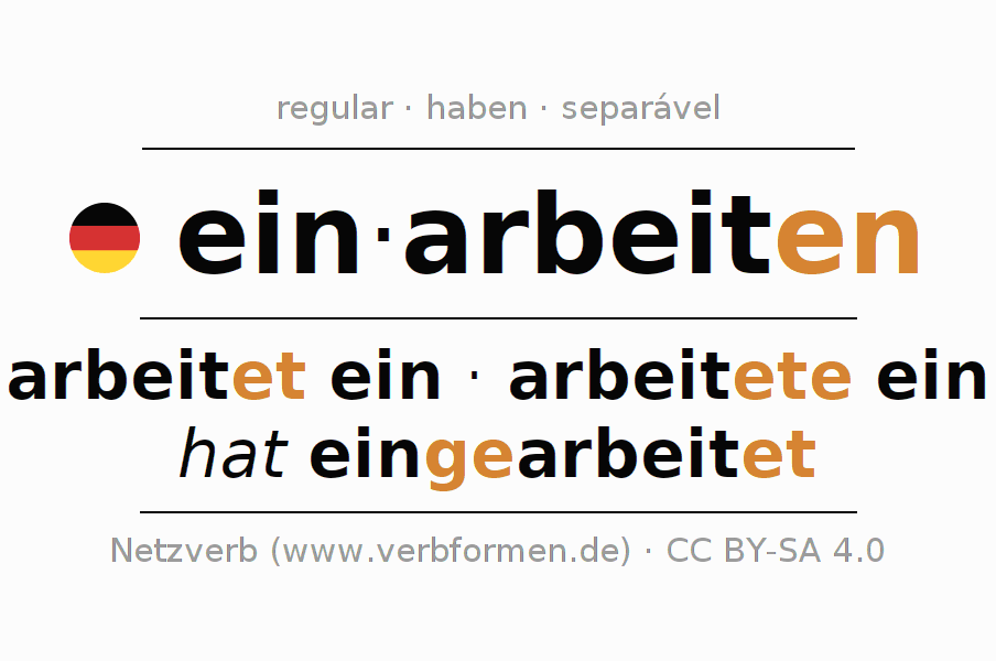 A conjugação do verbo ein·arbeiten é apresentada online assim como a Tabela de Verbo com todas as formas verbais no singular e no plural, e em todas as pessoas (1ª pessoa, 2ª pessoa, 3ª pessoa) A flexão do verbo ein·arbeiten é portanto, uma ajuda para os trabalhos de casa, testes, exames, aulas de alemão, para o estudo do alemão como língua estrangeira, como segunda língua e também na formação de adultos. Especialmente no aprendizado do alemão é importante a conjugação correta do verbo com as respectivamente formas flexionadas corretamente (arbeitet ein - arbeitete ein - hat eingearbeitet). Mais informações podem ser encontradas no Wiktionary einarbeiten e no Duden einarbeiten.