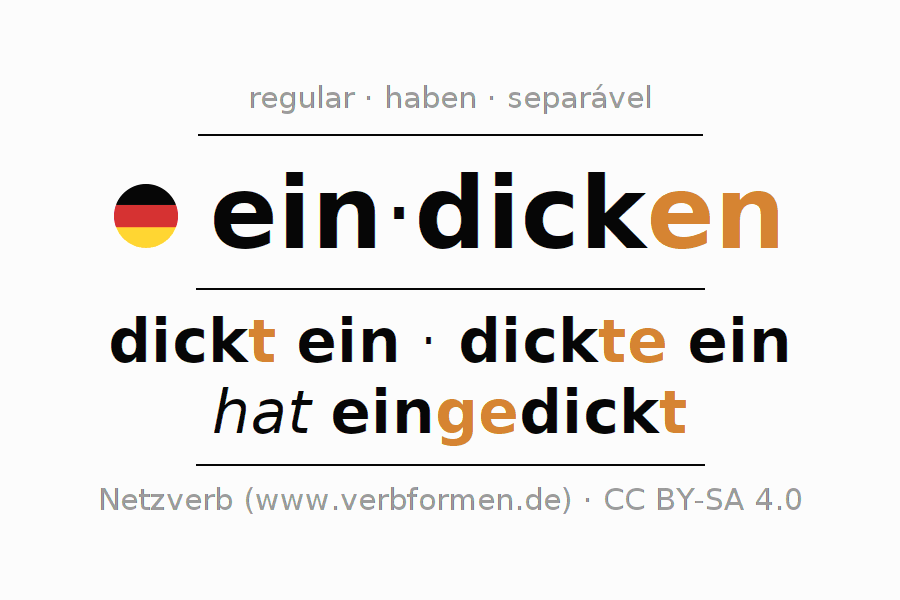 A conjugação do verbo eindicken (engrossar, espessar) é regular. As formas mais comuns são dickt ein, dickte ein e hat eingedickt. O verbo auxilar para eindicken é "haben". No entanto, há formas verbais com o verbo auxiliar " sein".