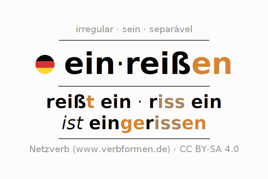 A conjugação do verbo einreißen (rasgar, fender) é irregular. As formas mais comuns são reißt ein, riss ein e ist eingerissen. A apofonia é feita com a vogal do radical ei