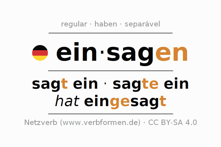 A conjugação do verbo ein·sagen é apresentada online assim como a Tabela de Verbo com todas as formas verbais no singular e no plural, e em todas as pessoas (1ª pessoa, 2ª pessoa, 3ª pessoa) A flexão do verbo ein·sagen é portanto, uma ajuda para os trabalhos de casa, testes, exames, aulas de alemão, para o estudo do alemão como língua estrangeira, como segunda língua e também na formação de adultos. Especialmente no aprendizado do alemão é importante a conjugação correta do verbo com as respectivamente formas flexionadas corretamente (sagt ein - sagte ein - hat eingesagt). Mais informações podem ser encontradas no Wiktionary einsagen e no Duden einsagen.