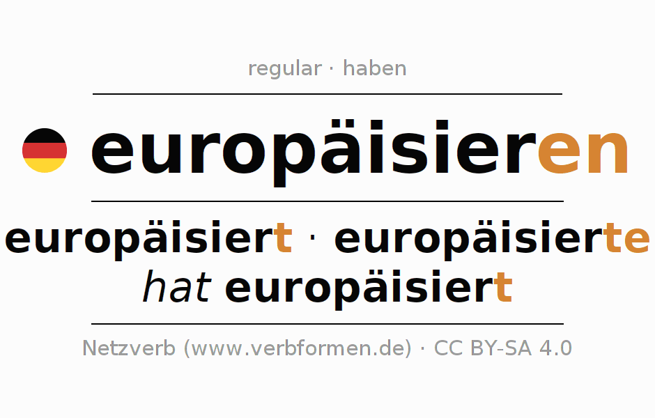 A conjugação do verbo europäisieren (europeizar) é regular. As formas mais comuns são europäisiert, europäisierte e hat europäisiert. O verbo auxilar para europäisieren é "haben".