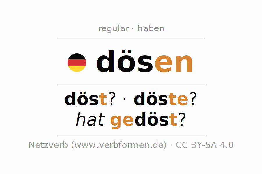 Exemplos do uso da Conjugação do verbo dösen. Estas são frases reais e frases do projeto Tatoeba. Para cada forma conjugada, será exibida uma sentença como exemplo. A forma verbal é destacada. Se houver mais de uma frase, um exemplo com o verbo alemão dösen será selecionado. A fim de entender a conjugação não apenas pelos exemplos, mas também para treinar, folhas de exercícios para o verbo dösen estão disponíveis.
