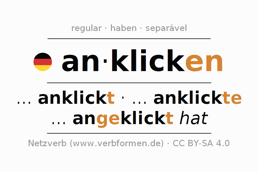 Exemplos do uso da Conjugação do verbo anklicken. Estas são frases reais e frases do projeto Tatoeba. Para cada forma conjugada, será exibida uma sentença como exemplo. A forma verbal é destacada. Se houver mais de uma frase, um exemplo com o verbo alemão anklicken será selecionado. A fim de entender a conjugação não apenas pelos exemplos, mas também para treinar, folhas de exercícios para o verbo anklicken estão disponíveis.