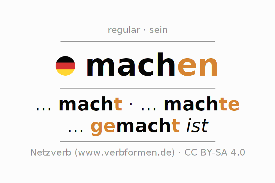 Exemplos do uso da Conjugação do verbo machen. Estas são frases reais e frases do projeto Tatoeba. Para cada forma conjugada, será exibida uma sentença como exemplo. A forma verbal é destacada. Se houver mais de uma frase, um exemplo com o verbo alemão machen (ist) será selecionado. A fim de entender a conjugação não apenas pelos exemplos, mas também para treinar, folhas de exercícios para o verbo machen estão disponíveis.