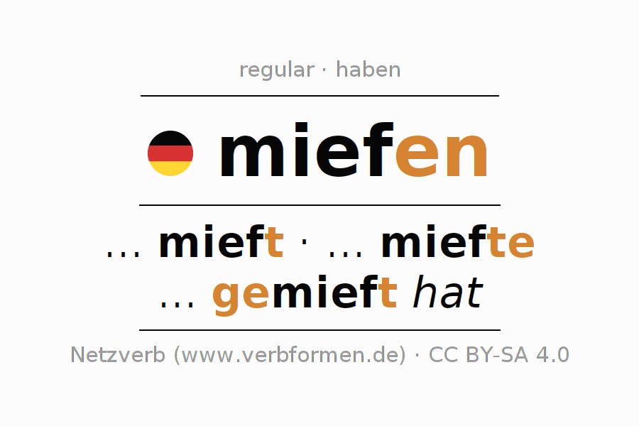 Exemplos do uso da Conjugação do verbo miefen. Estas são frases reais e frases do projeto Tatoeba. Para cada forma conjugada, será exibida uma sentença como exemplo. A forma verbal é destacada. Se houver mais de uma frase, um exemplo com o verbo alemão miefen será selecionado. A fim de entender a conjugação não apenas pelos exemplos, mas também para treinar, folhas de exercícios para o verbo miefen estão disponíveis.