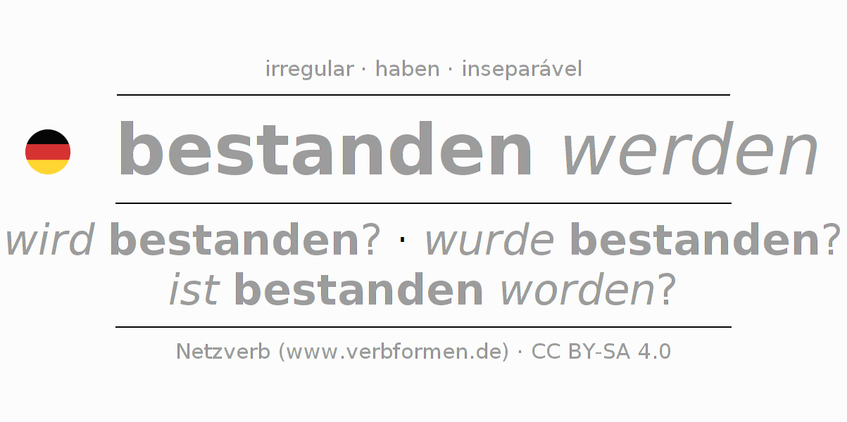 Exemplos do uso da Conjugação do verbo bestehen. Estas são frases reais e frases do projeto Tatoeba. Para cada forma conjugada, será exibida uma sentença como exemplo. A forma verbal é destacada. Se houver mais de uma frase, um exemplo com o verbo alemão bestehen será selecionado. A fim de entender a conjugação não apenas pelos exemplos, mas também para treinar, folhas de exercícios para o verbo bestehen estão disponíveis.