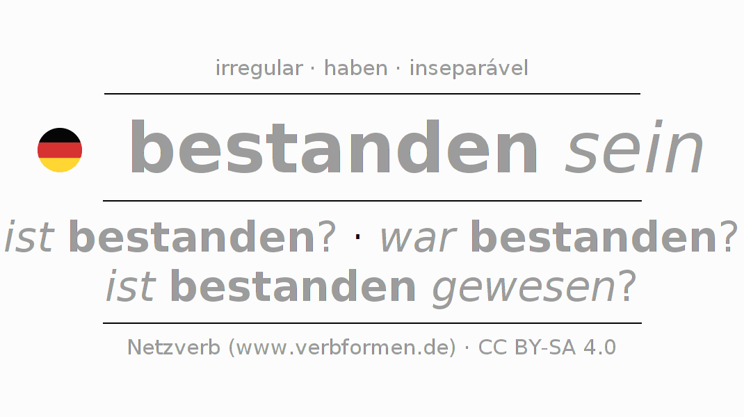 Exemplos do uso da Conjugação do verbo bestehen. Estas são frases reais e frases do projeto Tatoeba. Para cada forma conjugada, será exibida uma sentença como exemplo. A forma verbal é destacada. Se houver mais de uma frase, um exemplo com o verbo alemão bestehen será selecionado. A fim de entender a conjugação não apenas pelos exemplos, mas também para treinar, folhas de exercícios para o verbo bestehen estão disponíveis.