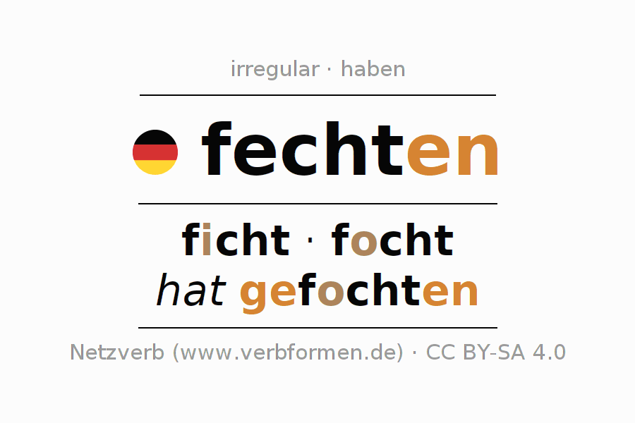 A conjugação do verbo fechten (combater, esgrima) é irregular. As formas mais comuns são ficht, focht e hat gefochten. A apofonia é feita com a vogal do radical e