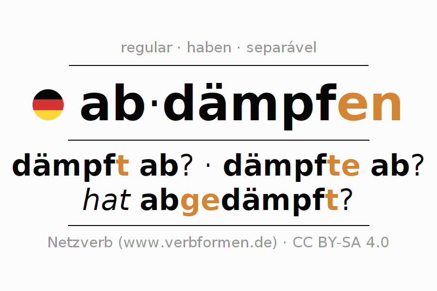 A conjugação do verbo abdämpfen (abafar, amortecer) é regular. As formas mais comuns são dämpft ab?, dämpfte ab? e hat abgedämpft?. O verbo auxilar para abdämpfen é "haben".