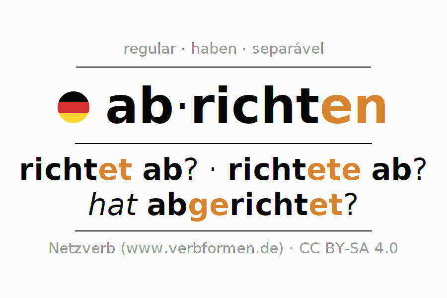 O prefixo ab - de abrichten é separável. A flexão ocorre em Ativo e é usada como Oração interrogativa. Para melhor compreensão estão disponíveis incontáveis. Exemplos do verbo abrichten . Para a prática e consolidação do estudo