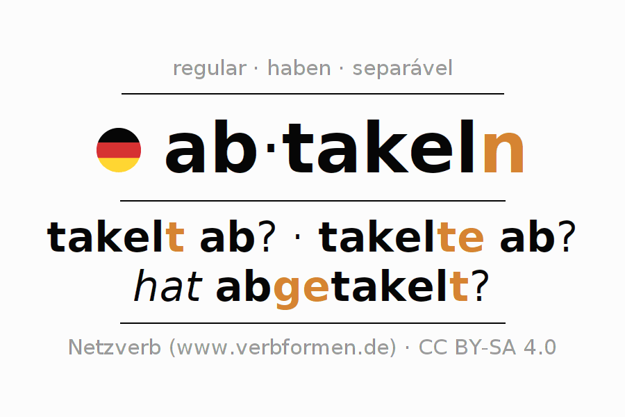 A conjugação do verbo abtakeln (desmantelar, desaparelhar) é regular. As formas mais comuns são takelt ab?, takelte ab? e hat abgetakelt?. O verbo auxilar para abtakeln é "haben".