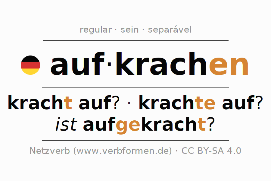 O prefixo auf - de aufkrachen é separável. A flexão ocorre em Ativo e é usada como Oração interrogativa. Para melhor compreensão estão disponíveis incontáveis. Exemplos do verbo aufkrachen . Para a prática e consolidação do estudo