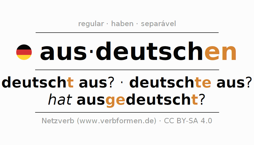 A conjugação do verbo ausdeutschen (explicar, tornar claro) é regular. As formas mais comuns são deutscht aus?, deutschte aus? e hat ausgedeutscht?. O verbo auxilar para ausdeutschen é "haben".