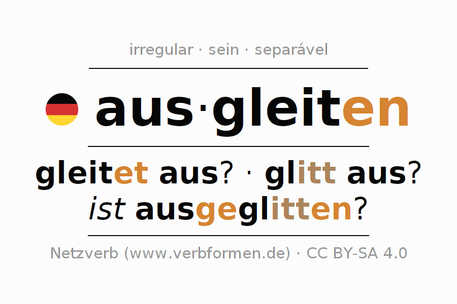 O prefixo aus - de ausgleiten é separável. A flexão ocorre em Ativo e é usada como Oração interrogativa. Para melhor compreensão estão disponíveis incontáveis. Exemplos do verbo ausgleiten . Para a prática e consolidação do estudo