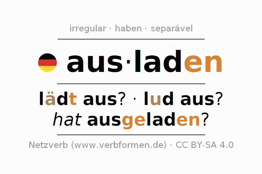 A conjugação do verbo ausladen (descarregar, desconvidar) é irregular. As formas mais comuns são lädt aus?, lud aus? e hat ausgeladen?. A apofonia é feita com a vogal do radical a