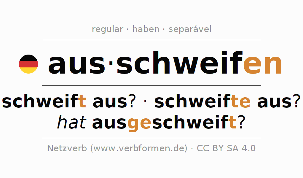 O prefixo aus - de ausschweifen é separável. A flexão ocorre em Ativo e é usada como Oração interrogativa. Para melhor compreensão estão disponíveis incontáveis. Exemplos do verbo ausschweifen . Para a prática e consolidação do estudo