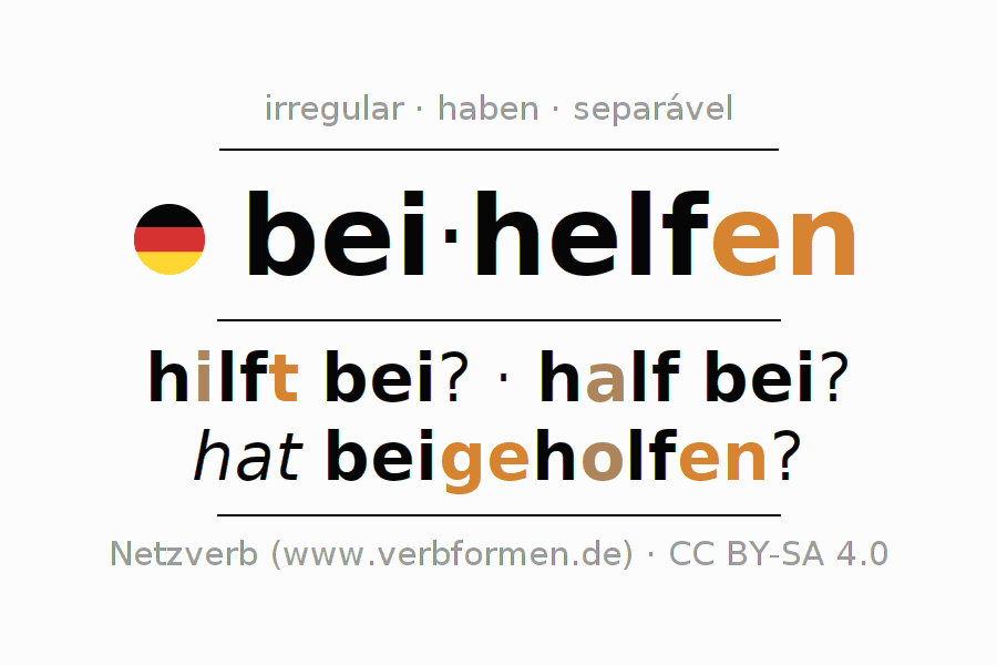 A conjugação do verbo bei·helfen é apresentada online assim como a Tabela de Verbo com todas as formas verbais no singular e no plural, e em todas as pessoas (1ª pessoa, 2ª pessoa, 3ª pessoa) A flexão do verbo bei·helfen é portanto, uma ajuda para os trabalhos de casa, testes, exames, aulas de alemão, para o estudo do alemão como língua estrangeira, como segunda língua e também na formação de adultos. Especialmente no aprendizado do alemão é importante a conjugação correta do verbo com as respectivamente formas flexionadas corretamente (hilft bei? - half bei? - hat beigeholfen?). Mais informações podem ser encontradas no Wiktionary beihelfen e no Duden beihelfen.