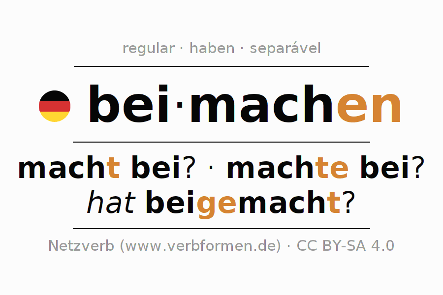 A conjugação do verbo beimachen (aparecer, começar) é regular. As formas mais comuns são macht bei?, machte bei? e hat beigemacht?. O verbo auxilar para beimachen é "haben".