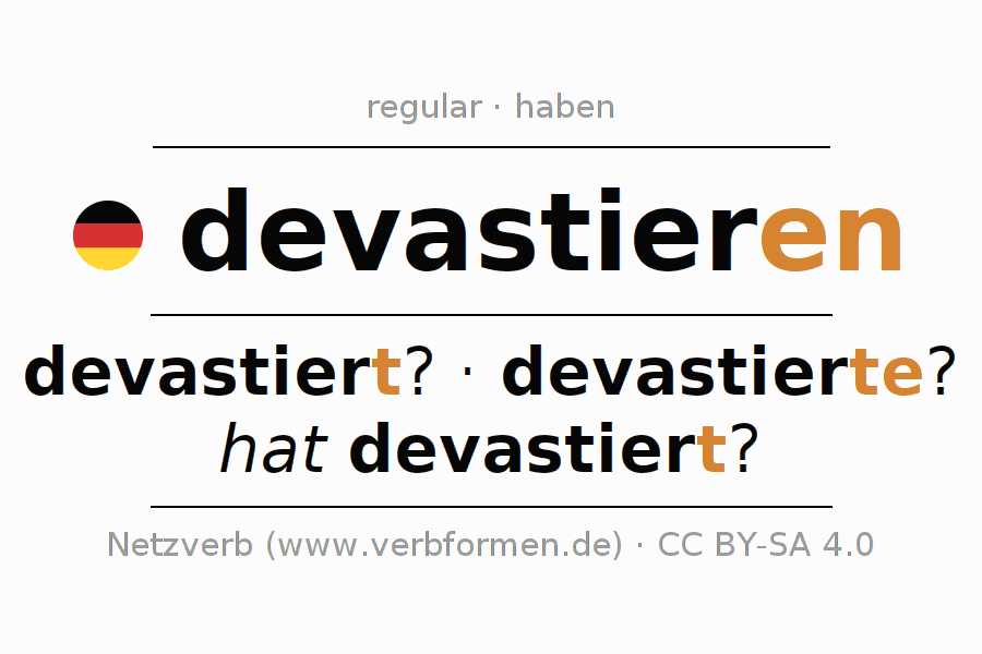 A conjugação do verbo devastieren (destruir, devastar) é regular. As formas mais comuns são devastiert?, devastierte? e hat devastiert?. O verbo auxilar para devastieren é "haben".