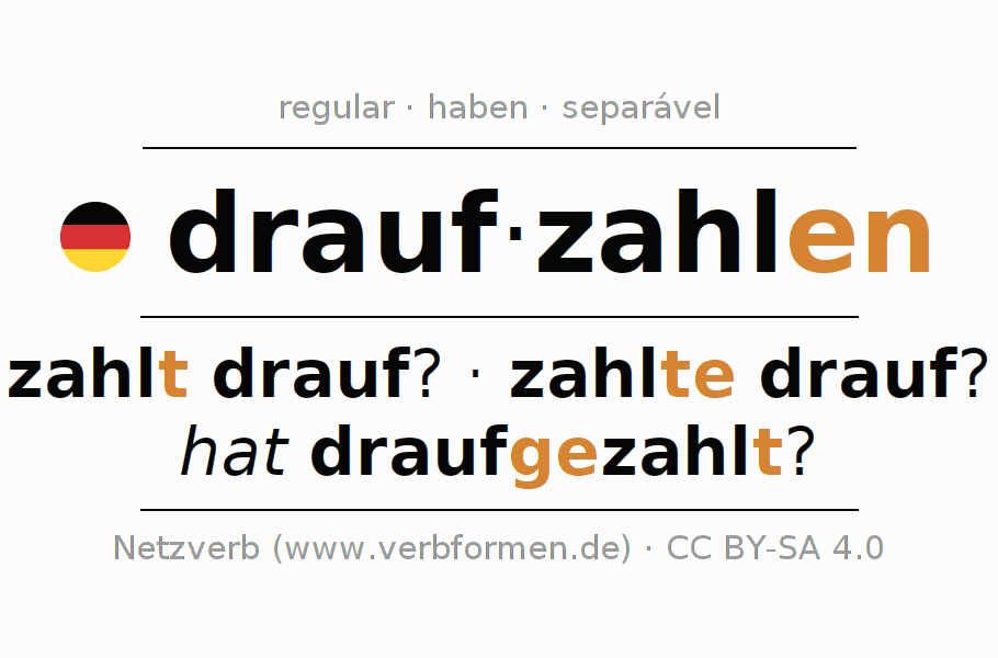 A conjugação do verbo draufzahlen (pagar a mais, acrescentar) é regular. As formas mais comuns são zahlt drauf?, zahlte drauf? e hat draufgezahlt?. O verbo auxilar para draufzahlen é "haben".