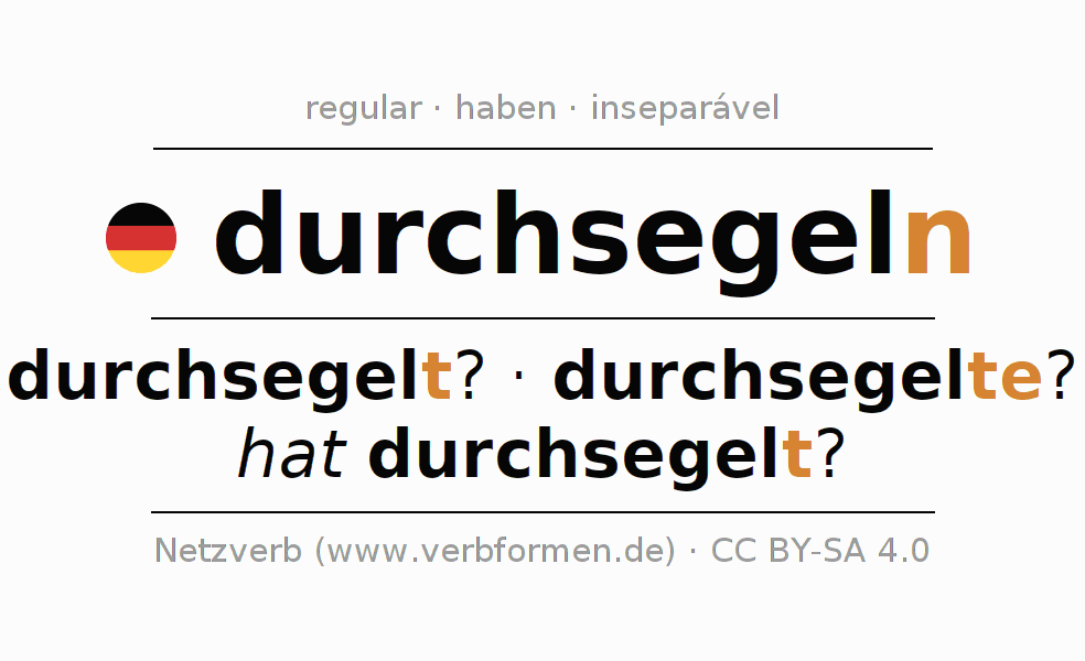 A conjugação do verbo durchsegeln (atravessar, navegar) é regular. As formas mais comuns são durchsegelt?, durchsegelte? e hat durchsegelt?. O verbo auxilar para durchsegeln é "haben". No entanto, há formas verbais com o verbo auxiliar " sein".