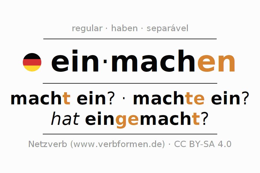 A conjugação do verbo einmachen (compota, conserva) é regular. As formas mais comuns são macht ein?, machte ein? e hat eingemacht?. O verbo auxilar para einmachen é "haben".