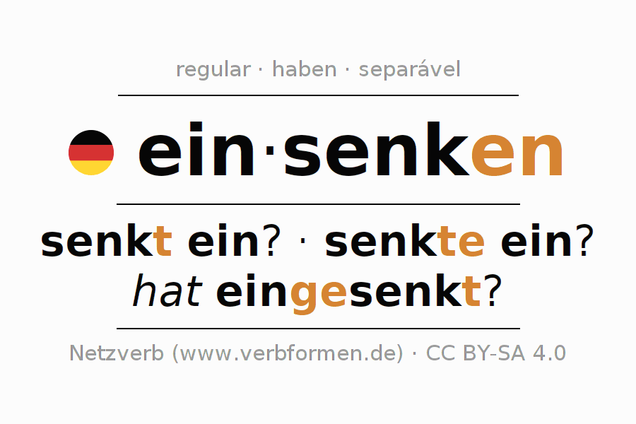 A conjugação do verbo einsenken (afundar, imergir) é regular. As formas mais comuns são senkt ein?, senkte ein? e hat eingesenkt?. O verbo auxilar para einsenken é "haben".