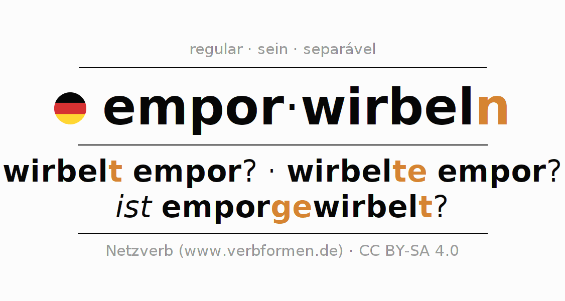 A conjugação do verbo emporwirbeln (agitar, levantar) é regular. As formas mais comuns são wirbelt empor?, wirbelte empor? e ist emporgewirbelt?. O verbo auxilar para emporwirbeln é "sein". No entanto, há formas verbais com o verbo auxiliar " haben".