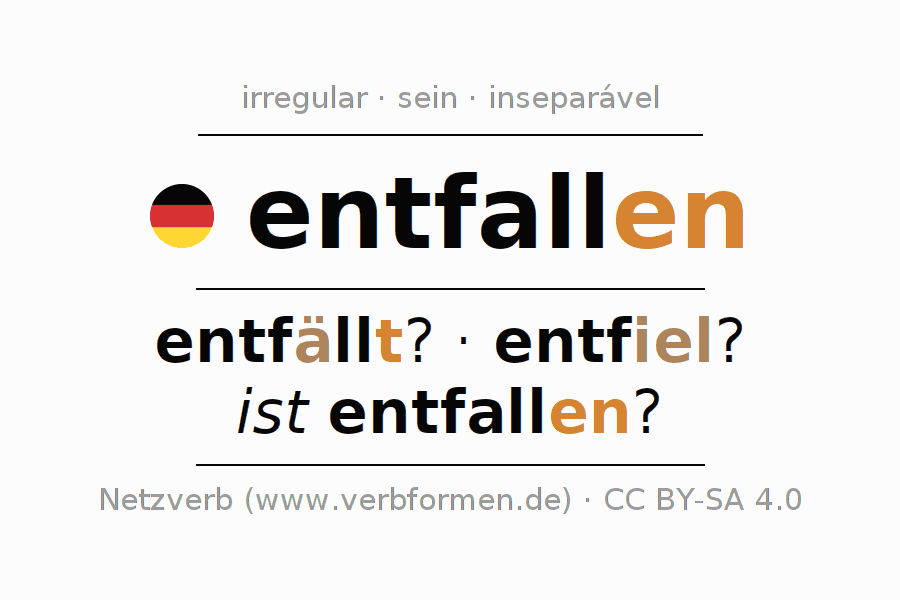 O prefixo ent- de entfallen é inseparável. A flexão ocorre em Ativo e é usada como Oração interrogativa. Para melhor compreensão estão disponíveis incontáveis. Exemplos do verbo entfallen . Para a prática e consolidação do estudo