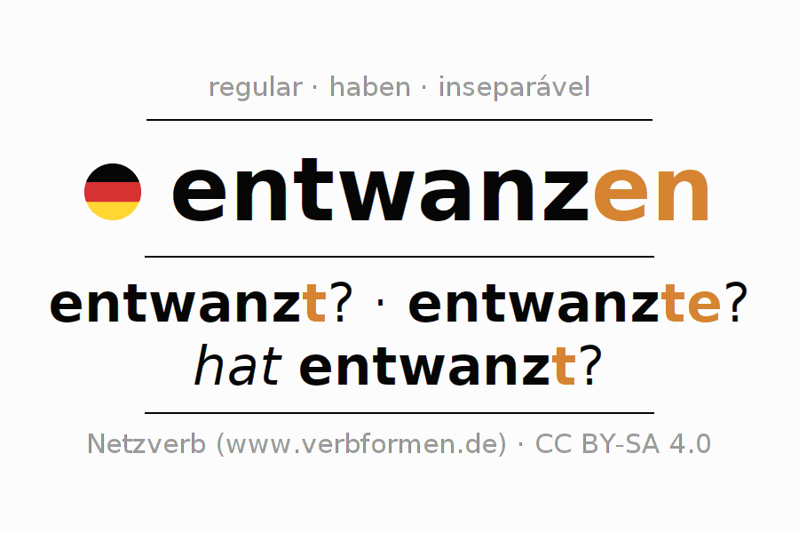 O prefixo ent- de entwanzen é inseparável. A flexão ocorre em Ativo e é usada como Oração interrogativa. Para melhor compreensão estão disponíveis incontáveis. Exemplos do verbo entwanzen . Para a prática e consolidação do estudo