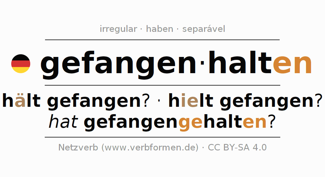A conjugação do verbo gefangenhalten (prender, mantener preso) é irregular. As formas mais comuns são hält gefangen?, hielt gefangen? e hat gefangengehalten?. A apofonia é feita com a vogal do radical a