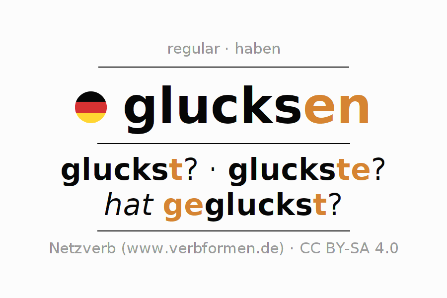 A conjugação do verbo glucksen é apresentada online assim como a Tabela de Verbo com todas as formas verbais no singular e no plural, e em todas as pessoas (1ª pessoa, 2ª pessoa, 3ª pessoa) A flexão do verbo glucksen é portanto, uma ajuda para os trabalhos de casa, testes, exames, aulas de alemão, para o estudo do alemão como língua estrangeira, como segunda língua e também na formação de adultos. Especialmente no aprendizado do alemão é importante a conjugação correta do verbo com as respectivamente formas flexionadas corretamente (gluckst? - gluckste? - hat gegluckst?). Mais informações podem ser encontradas no Wiktionary glucksen e no Duden glucksen.